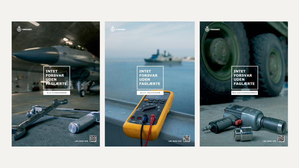 Udover at værnepligten er en basis militæruddannelse - er det også en rekrutteringsbase for Forsvaret til deres andre uddannelser. Ikke alle har akademiske interesser – og der er stort behov for mange, der har hænderne skruet godt på til både militære- og civile uddannelser: Flymekanikere, kontorelever, IT-specialister, lastvognsmekanikere, teknikere mfl. Vi udviklede kampagnekonceptet "Intet Forsvar uden faglærte", for at hæve vigtigheden at netop deres arbejde. For der er ingen kampfly der letter, eller skibe der sejler uden faglærte. Visuelt har vi vægtet netop det taktile: Værktøj, skruer, detaljer - alt det, som tiltaler målgruppen fremfor boglige fagligheder.