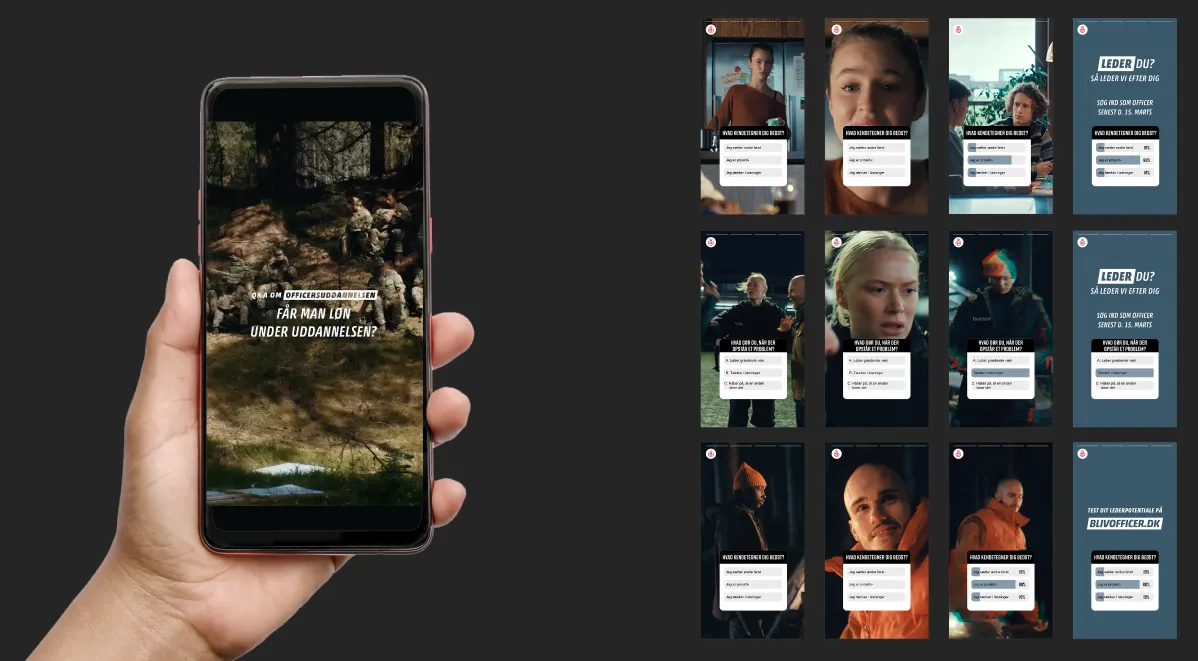 Udover det appelskabende herospor havde vi også underliggende kampagnespor, der skulle øge det kvalificerede kendskab til hhv. jobbet og uddannelsen: Indtræksfilm med officerer i særlige arbejdssituationer, der ledte ind til længere og dybdegående videoartikler. Derudover indtræksfilm til vores prisvindende dokuserie i 3 sæsoner, hvor vi følger kadetter på officersuddannelsen, q&a om officersuddannelsen, involverende SoMe-quiz spor, podcast med Fuhlendorff og nativearktikler. Herunder også mindre taktiske spor som “søg nu”. Rekrutteringsmålene blev nået med kampagnen.