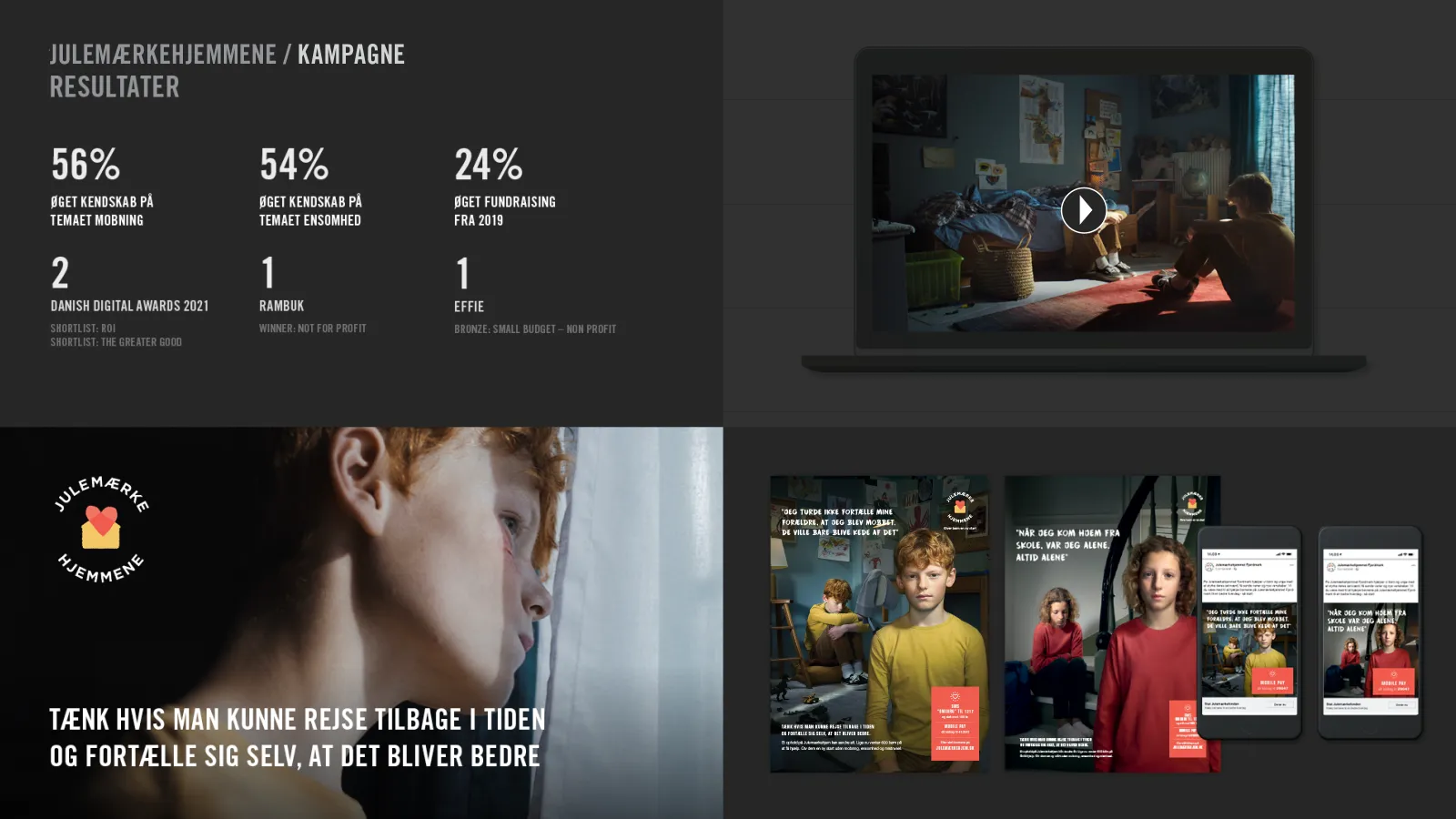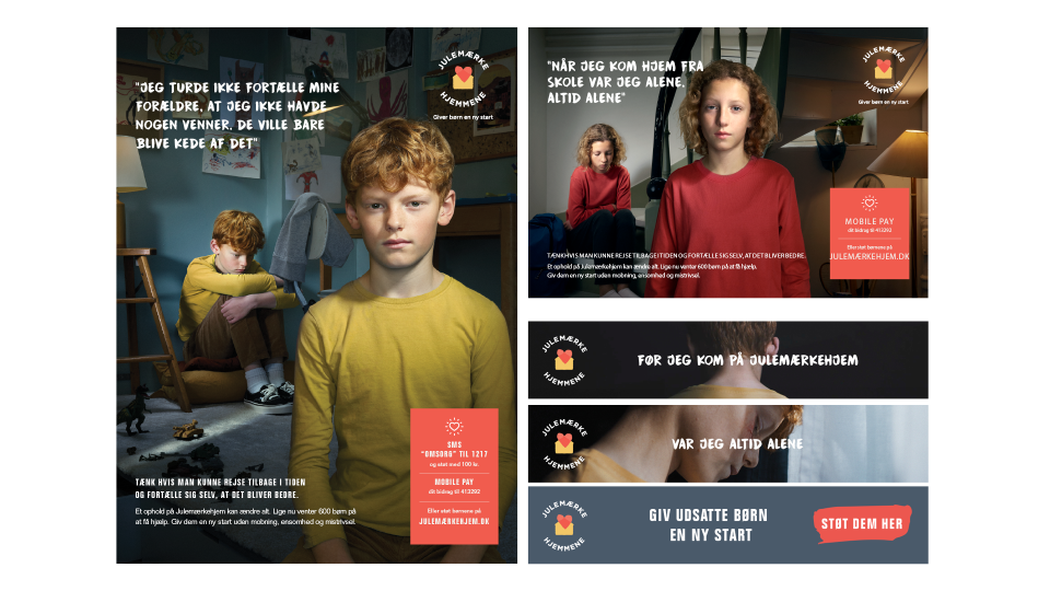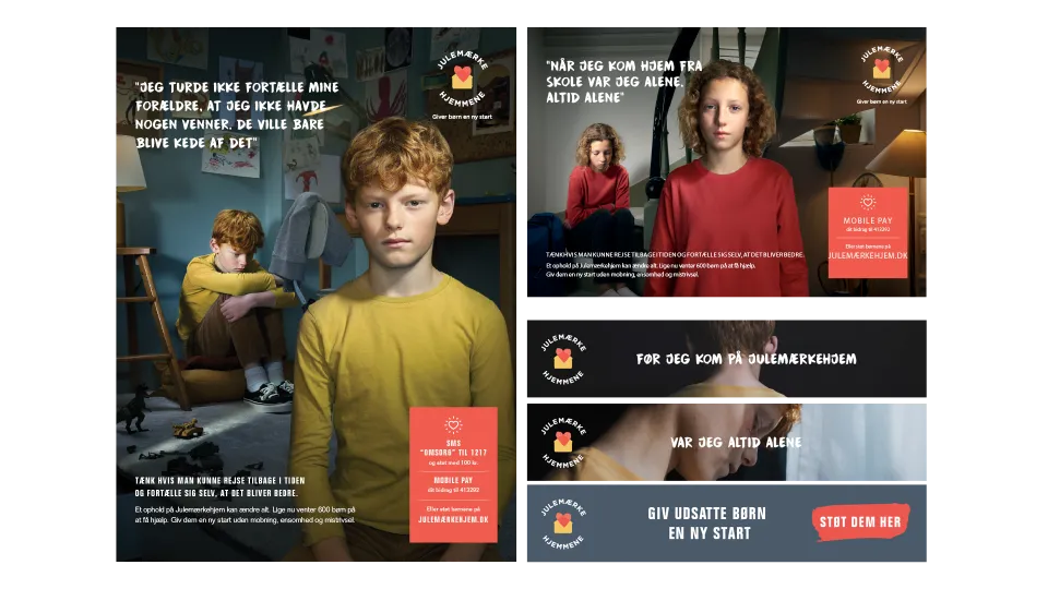I kampagnen satte vi fokus på den unikke forvandling, børn oplever under opholdet. Gennem portrætter og det visuelle greb med ”det dobbelte barn” viste vi kontrasten før og efter – både på print og digitalt – suppleret af mere taktiske displayformater, der skabte øjeblikkelig opmærksomhed om behovet for støtte.