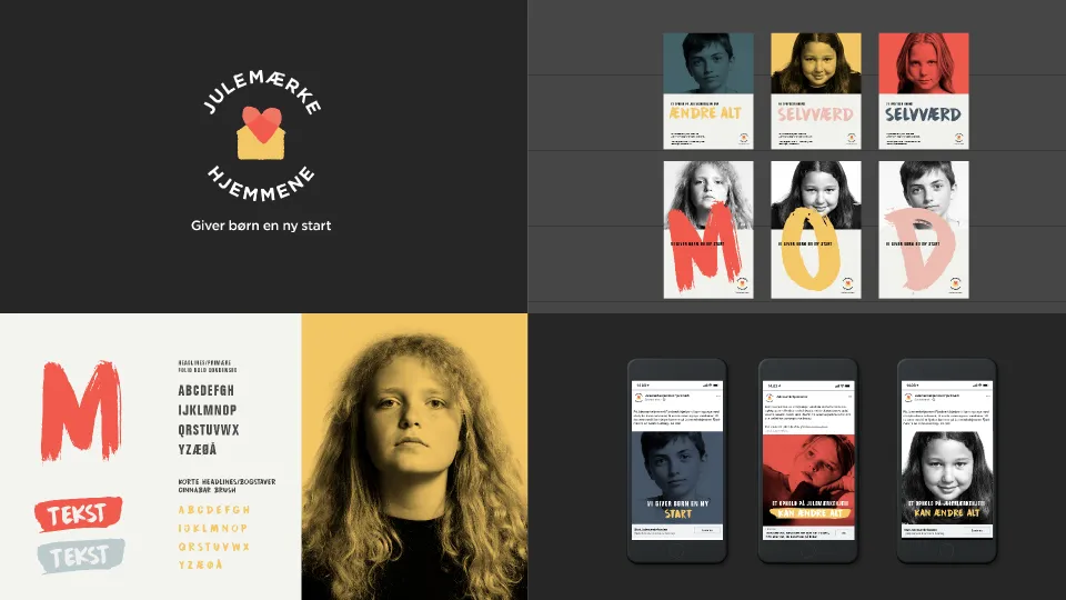 For at rammesætte kernefortællingen “giver børn en ny start” udviklede jeg et nyt logo, visuel identitet og designguide for Julemærkehjemmene. Logoet formidler idéen om et hjem med hjerterum, mens kraftige farver, rå børneskrift og en billedstil med børn fulde af overskud og selvtillid understøtter fortællingen.
